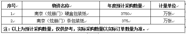 4、南京(炫赫門)硬盒包裝紙不含稅中標(biāo)價:1001.7550元/萬張,南京(炫赫門)條包裝紙不含稅中標(biāo)價:4326.5550元/萬張,發(fā)票類型:增值稅專用發(fā)票,發(fā)票稅率:13%。